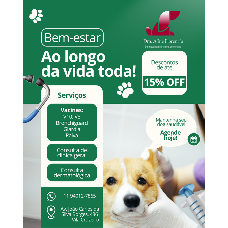 Na clínica da Dra. Aline Florencio, cada atendimento é personalizado, humano e acolhedor. Com formação sólida e quase duas décadas de prática, ela cuida com técnica, escuta e um olhar atento ao que realmente importa: o bem-estar completo do seu melhor amigo.